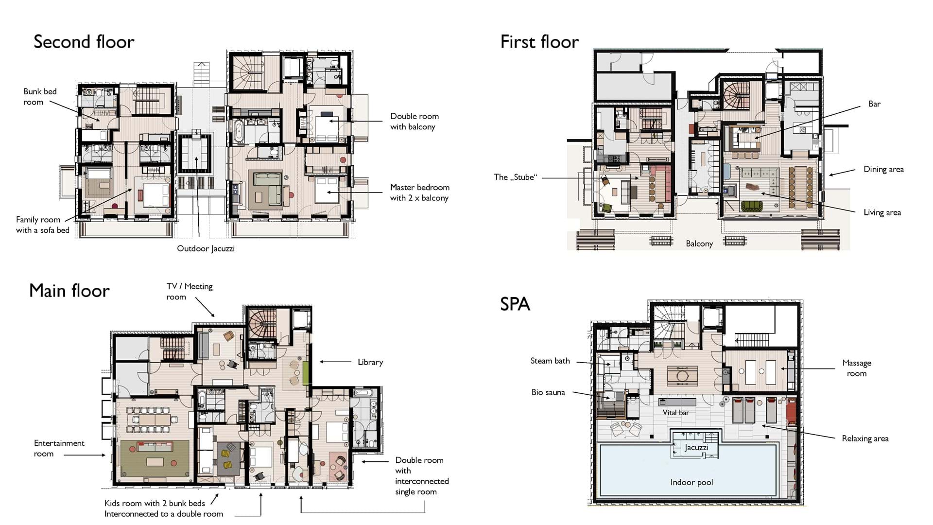 Covering over 830sqm, this luxury ski chalet centers around the open plan living and dining room and is a wonderful space, with huge windows and a cosy atmosphere. From here you can enjoy the magnificent views across the piste over towards Lech and Zurs beyond. The Master bedroom on the top floor is beautiful with a huge vaulted ceiling, large bathroom and dressing room. The other three main en suite bedrooms are extremely well-appointed.
