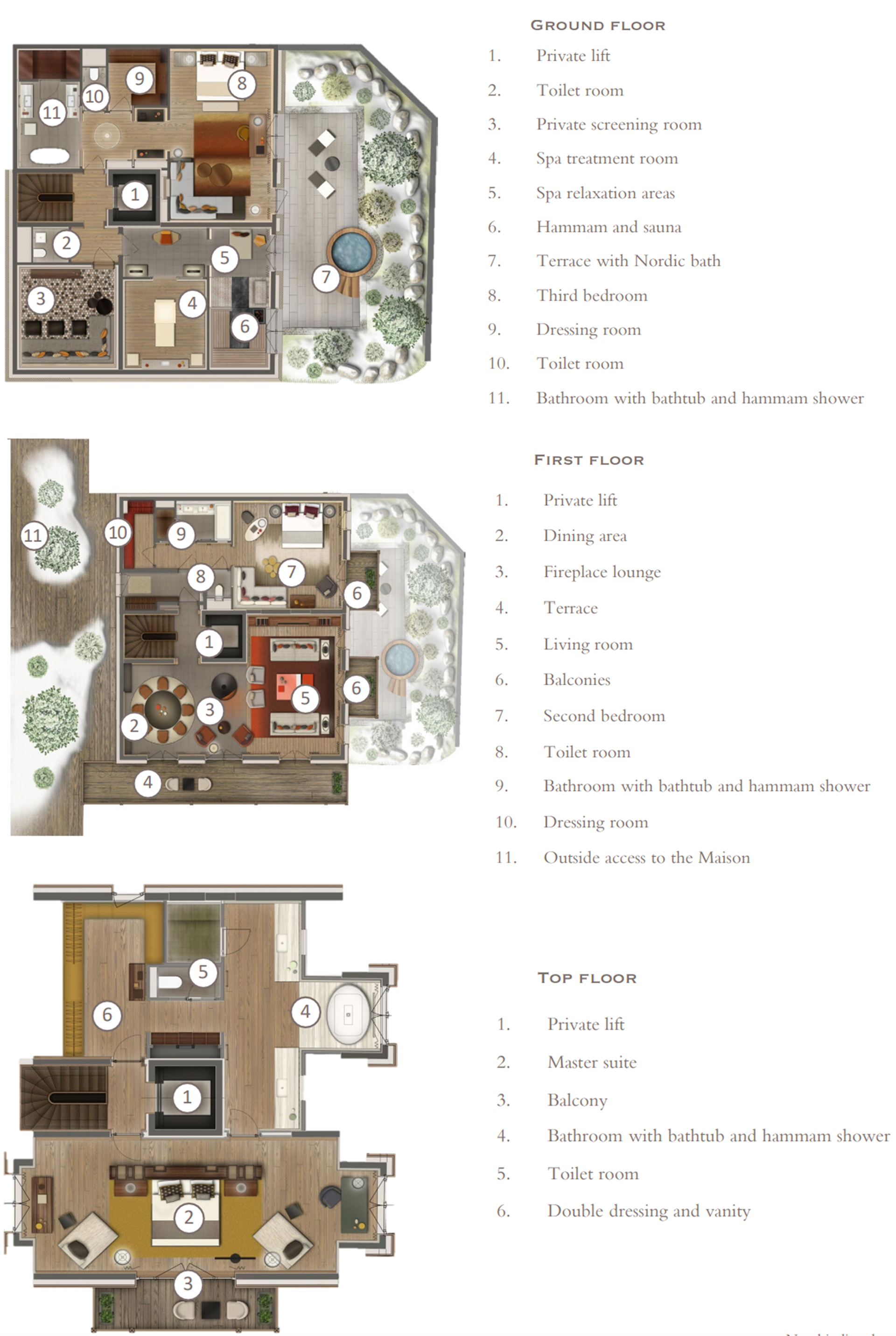 Designed across four elegant levels, Le Chalet accommodates up to six guests in three sumptuous suites, including a spectacular master suite with lounge area, expansive dressing room, and an indulgent bathroom featuring a double bathtub and chromotherapy hammam-shower. Every space reflects Cheval Blanc’s signature Mountain Chic aesthetic where contemporary design meets refined alpine warmth.
