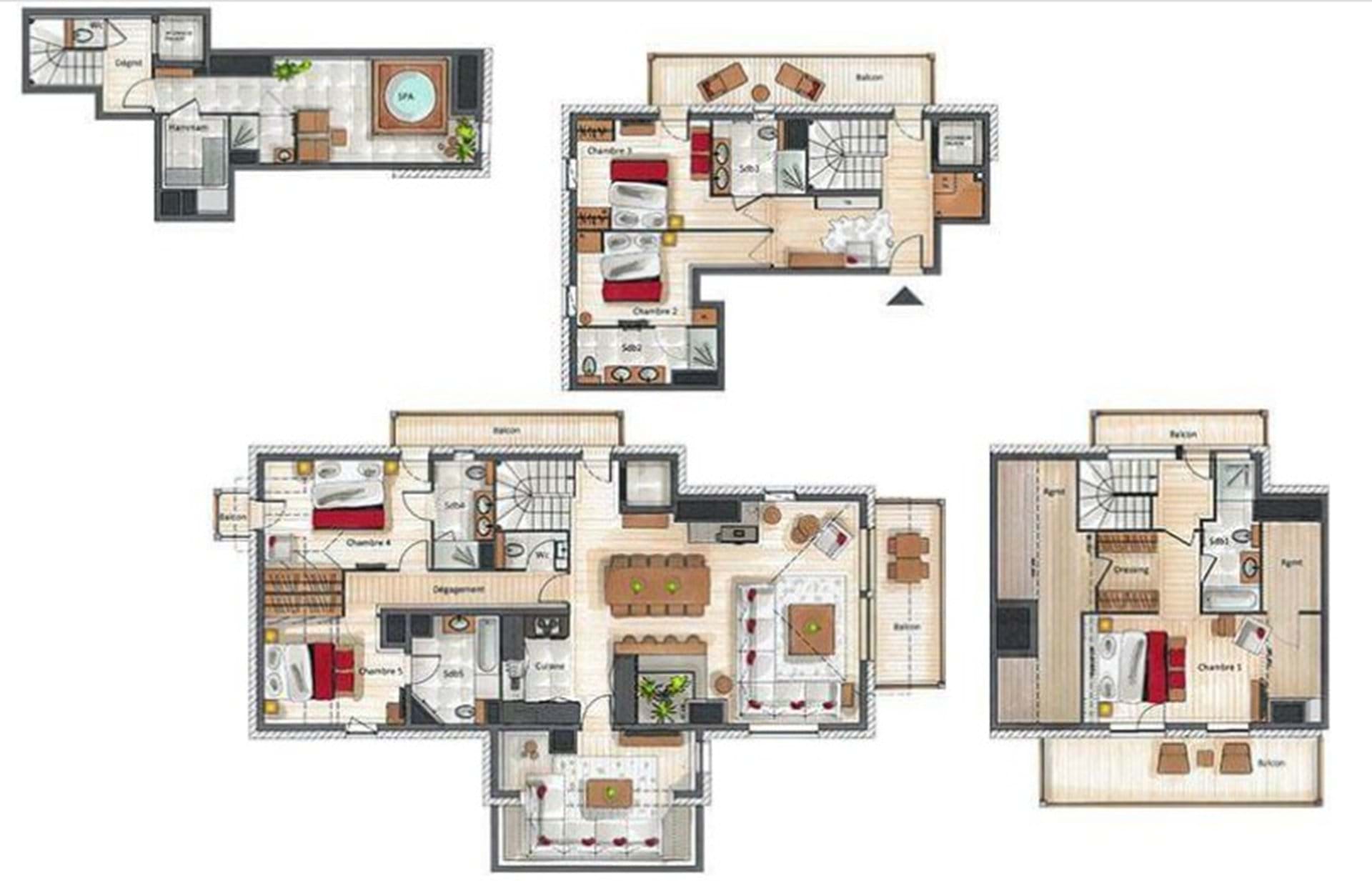With five elegant double bedrooms, each with its own en suite bathroom, Penthouse Koh I Nor balances shared living with personal privacy, making it an ideal setting for multi-generational families or close groups seeking a luxurious yet relaxed base in the mountains.