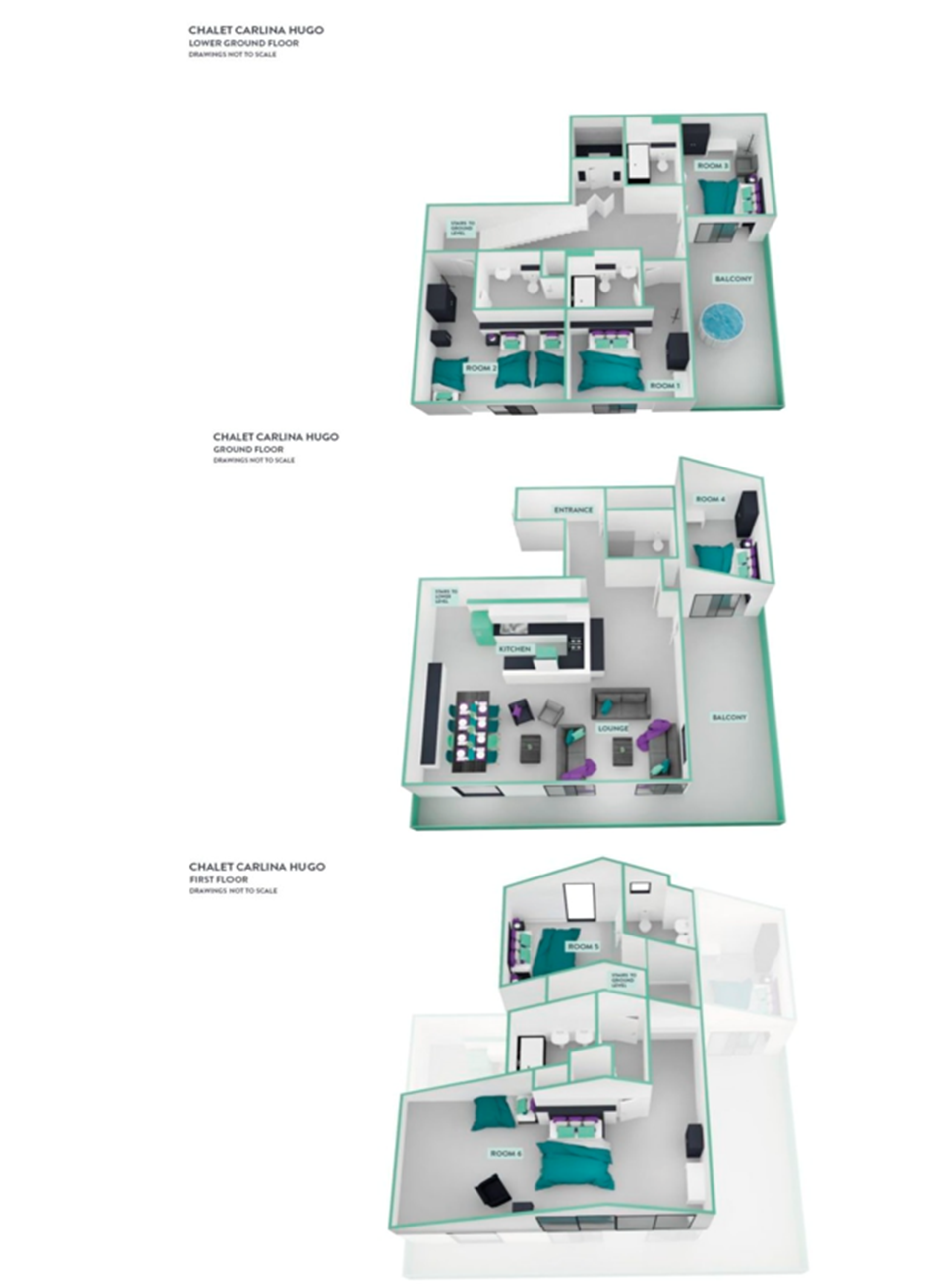 Laid out over three floors, Chalet Hugo sleeps up to 12 guests across six double/twin en suite bedrooms. Half of the bedrooms feature south facing terraces/balconies which offer glorious mountain views, and there’s floor to ceiling French doors leading to an outdoor Swedish bath. The living area has a cosy artificial fireplace to warm you up after a cold day on the slopes, plus there’s a kitchen on the same floor.