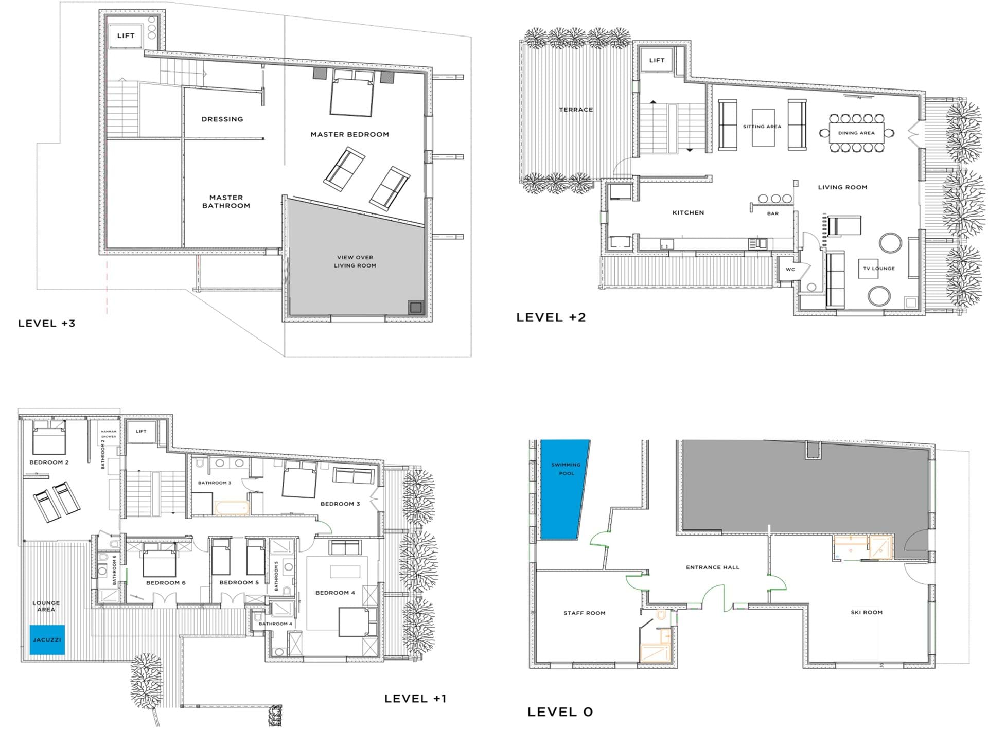 The level below accommodates five beautifully appointed bedrooms, including four double guest rooms with en suite bathrooms or shower rooms, balconies or terraces, and a children’s bedroom with two bunk beds sleeping four guests. A terrace with an outdoor jacuzzi and a sauna enhance the chalet’s wellness offering.