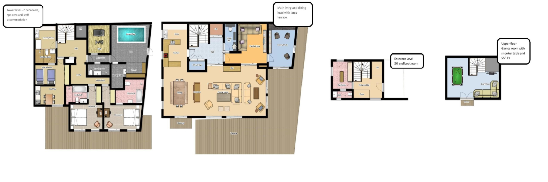 At street level, the main entrance leads into a foyer that looks down over the central living space which has vast, triple height windows and provides access to a well equipped boot room with adjoining cloakroom. Above this floor is a games room with snooker table and 55" TV - perfect as a teenage hangout or quiet area for younger family members. The main dining and lounge areas are spread across the entire width of the chalet, commanding a truly fabulous view.
