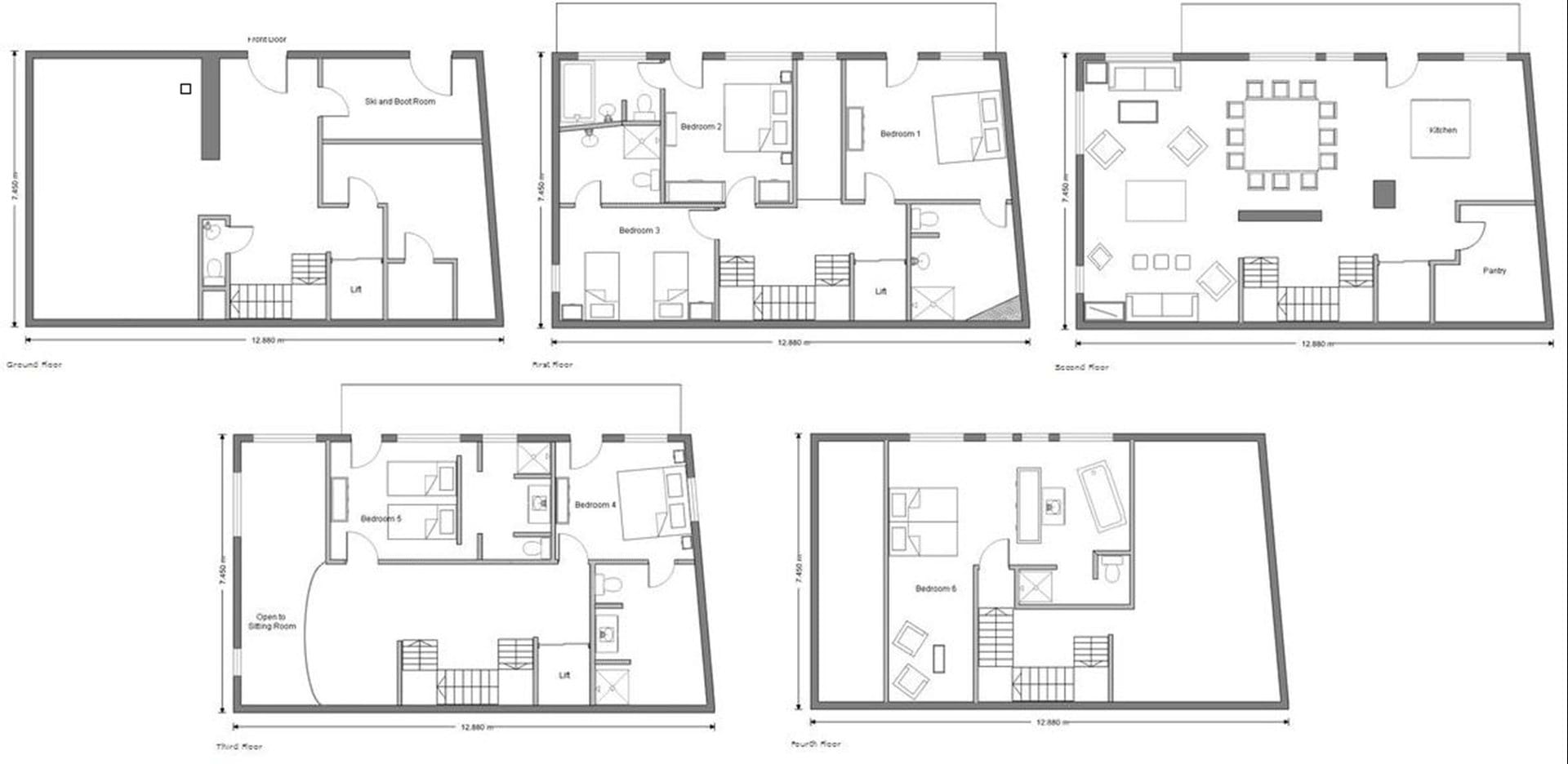 Spread over five floors, with lift access to the upper floors, glass, metal and wood have been used as construction materials for an exciting and modern take on the alpine chalet. The central atrium with its glass ceiling floods the interior of the chalet with light.