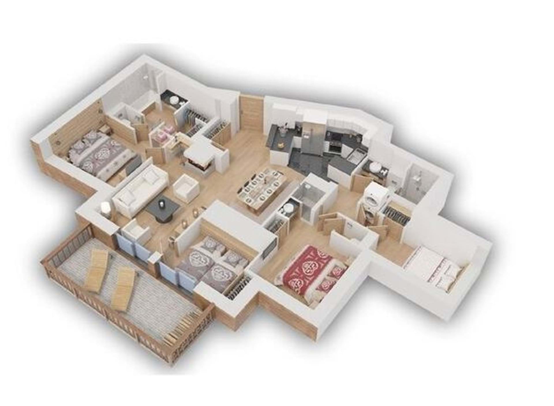 The 95sqm apartment is set out on one level and comprises of four double bedrooms, two of which have en suite bathrooms and an independent bathroom with separate toilet. A key feature of this luxury apartment is the spacious, open plan living area that flows through the apartment connecting the kitchen, dining area and lounge. This in turn leads out onto the sunny, private terrace with the open views of Val d'Isere resort and the infamous Face de Bellevarde ski run. This is an ideal spot to relax and take in the surroundings.