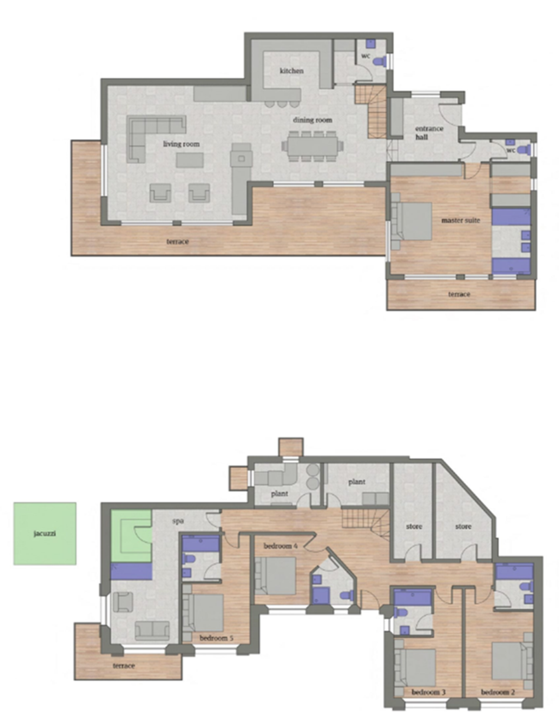 The chalet accommodates up to 12 guests in five beautifully appointed en suite bedrooms. The master suite features its own private balcony and a distinctive four-poster bed, adding a touch of romance and character.
